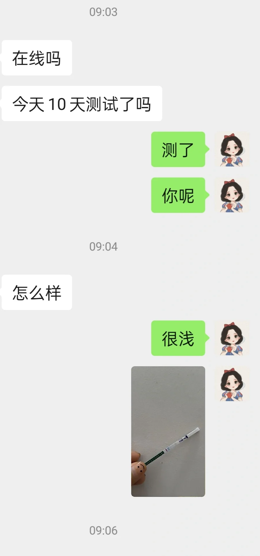 直到今天早上,她自己主动发信息找我,问我时间这么久了,测了没,然后就出现了图片上的聊天过程